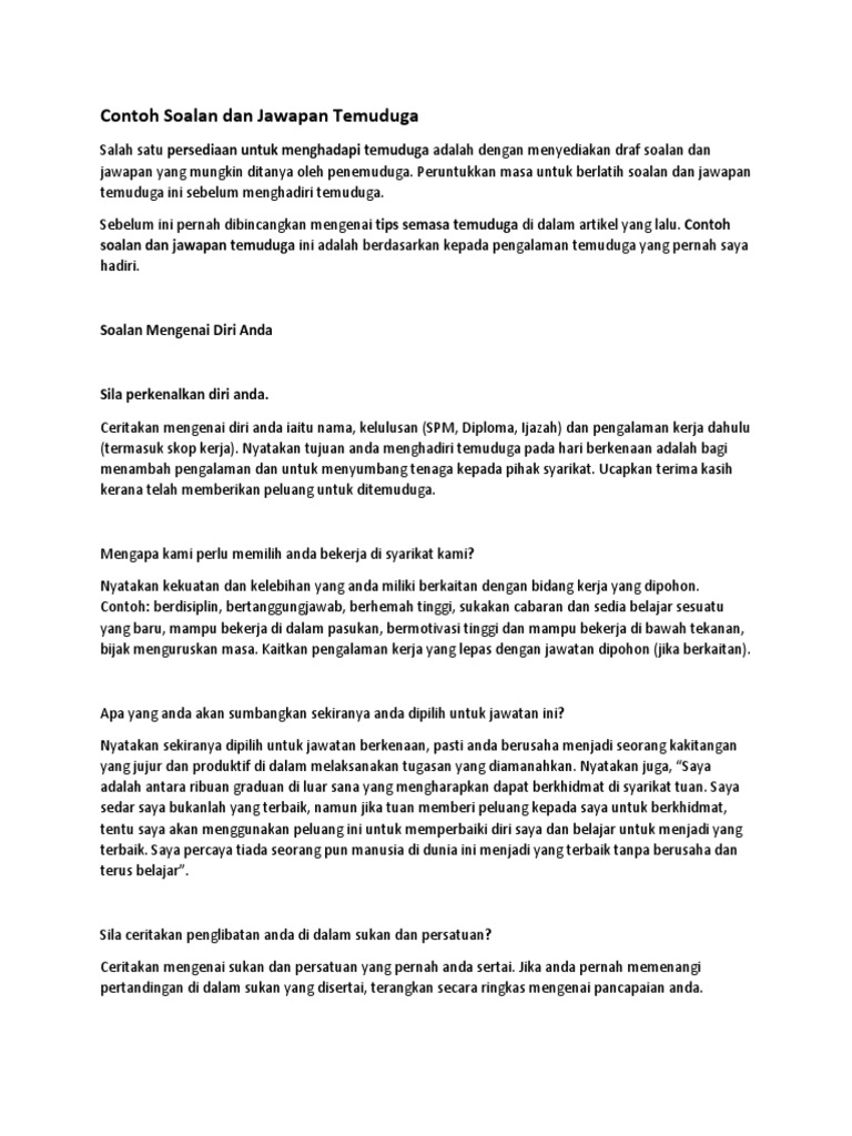 Contoh Soalan Temuduga Spa Beserta Jawapan. Berikut adalah contoh soalan temuduga spa kerja kerajaan yang berkaitan tentang pengenalan diri, kelayakan dan pengalaman, info jawatan, . Panduan ini di olah dan di susun oleh pakar dalam menyediakan rujukan peperiksaan online dan temuduga spa sejak 2009 yang mana telah membantu beratus ribu .